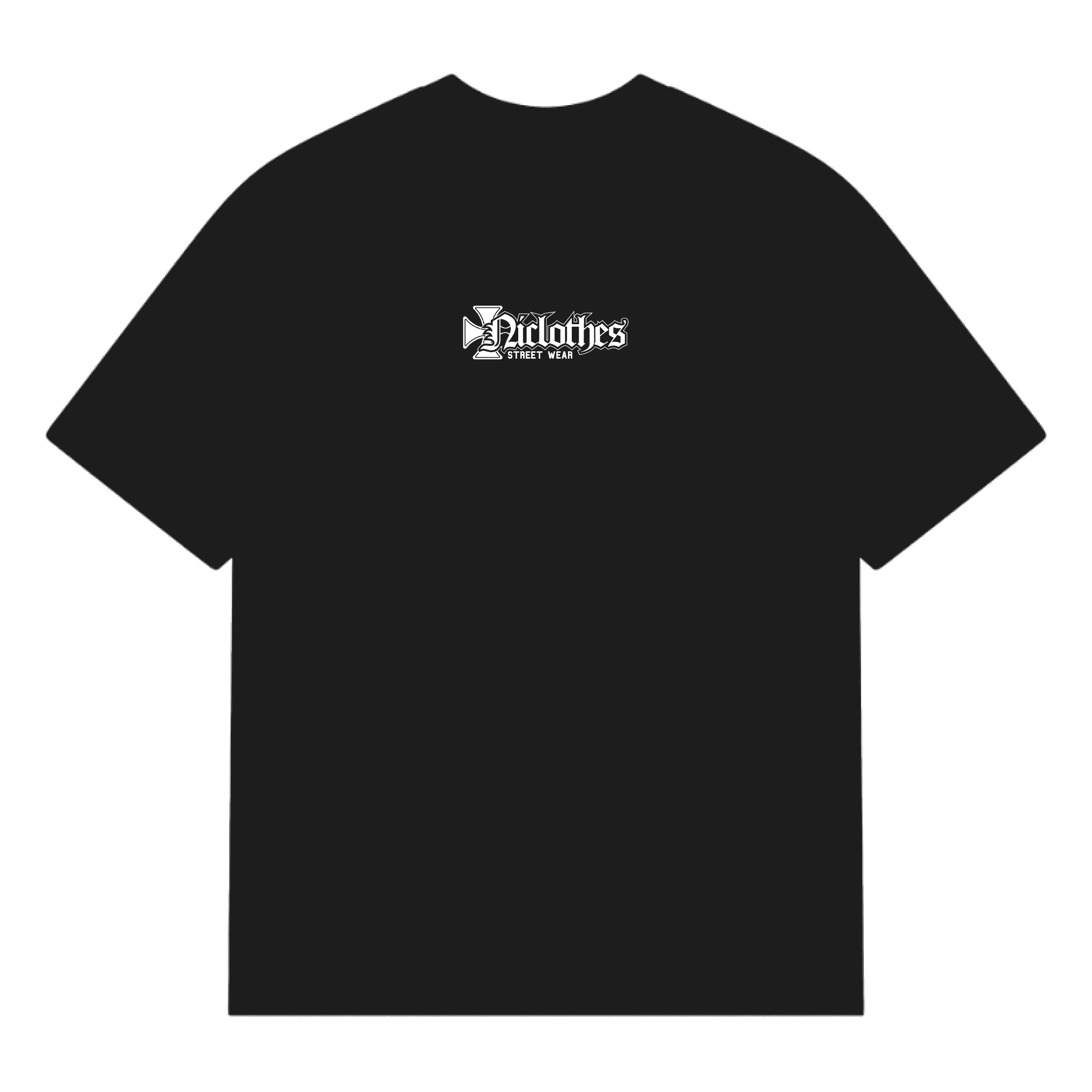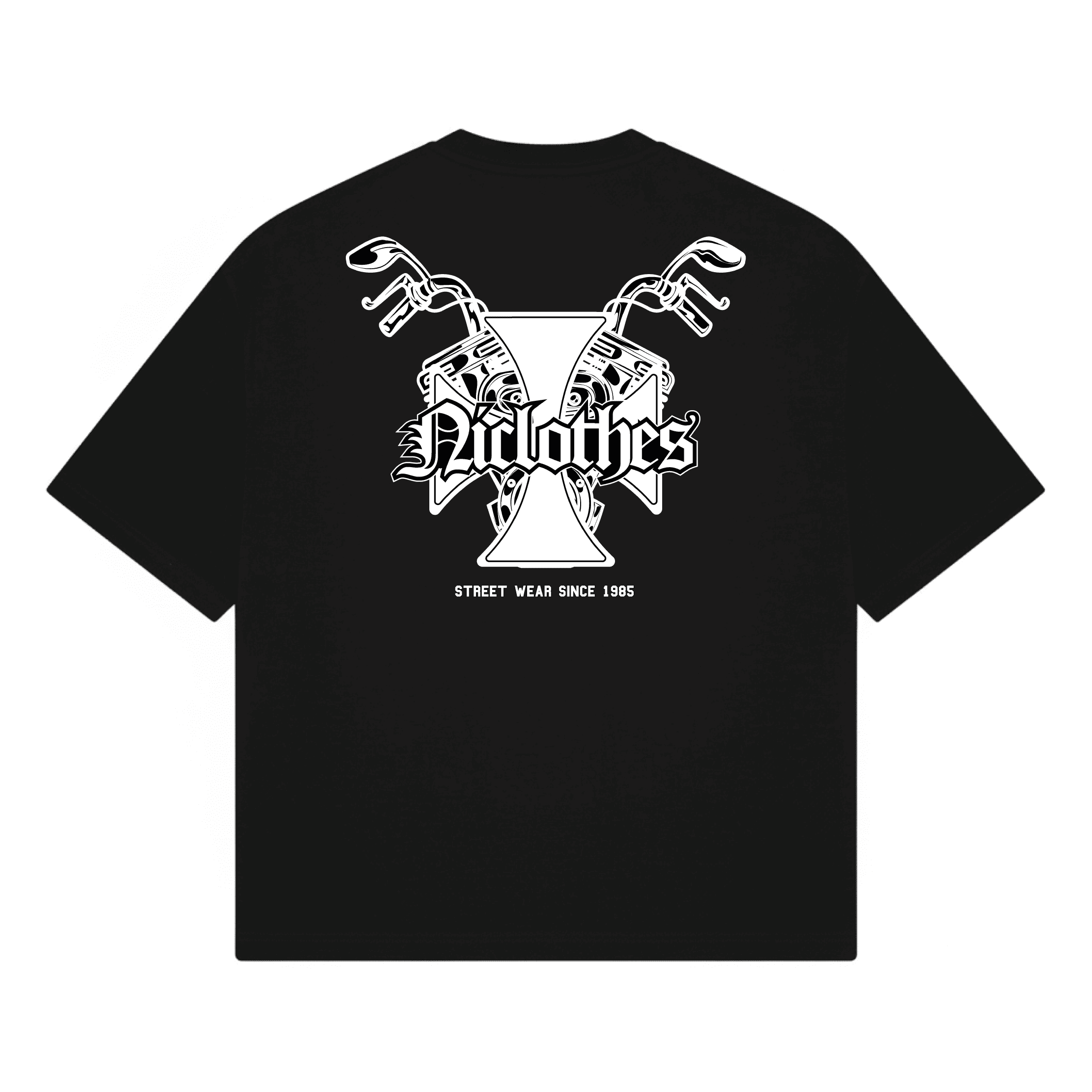 El estampado en blanco de alta definición destaca sobre la base negra y presenta una composición agresiva y detallada: motores cruzados, líneas afiladas y el icónico logo Niclothes en un estilo tipográfico marcado y potente. Un diseño que transmite fuerza, rebeldía y personalidad.